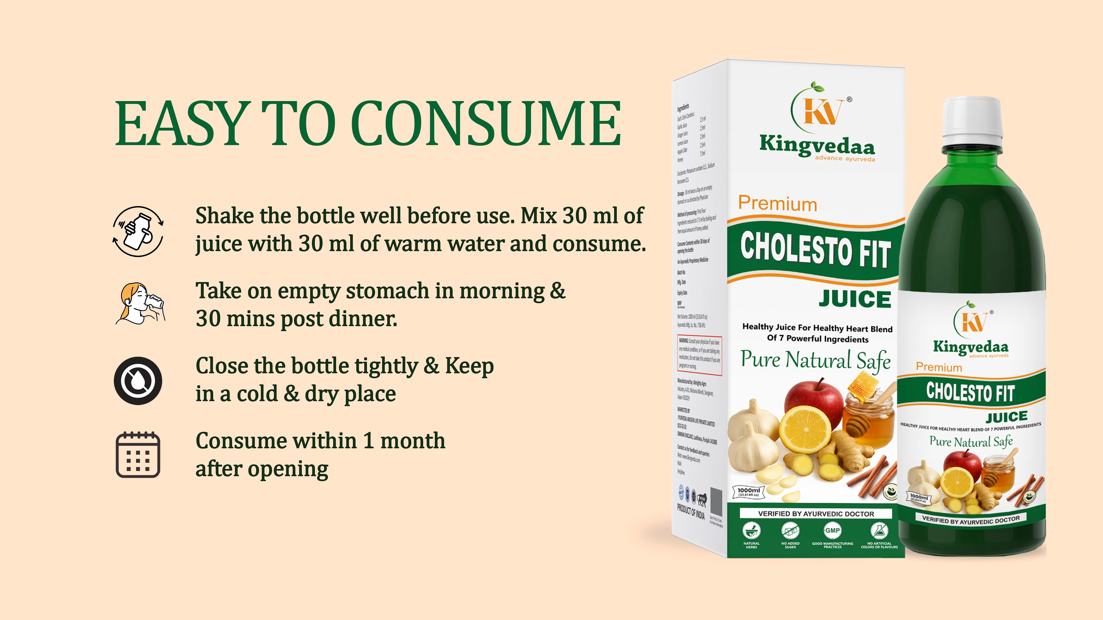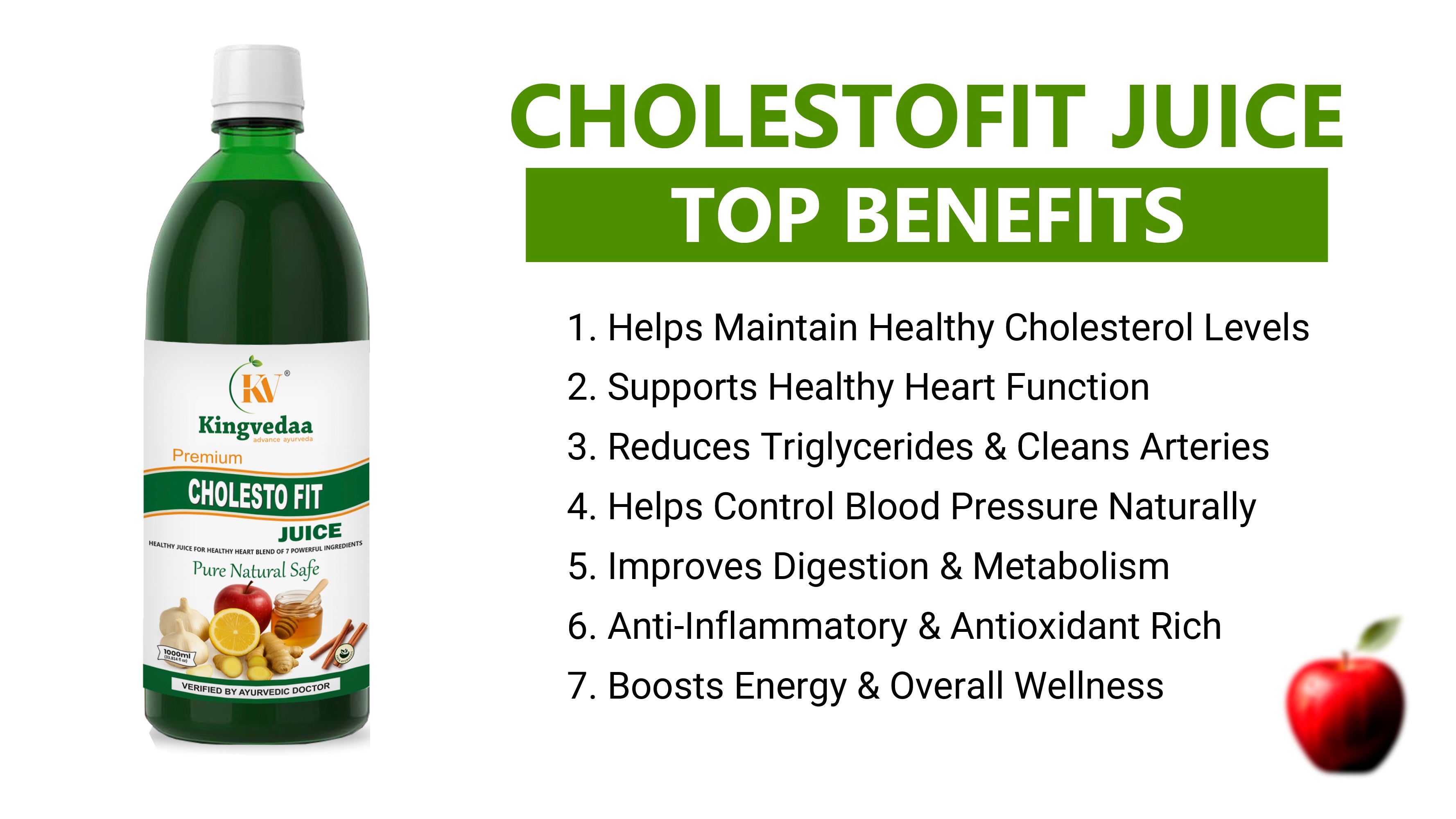 Kingvedaa Cholesto Fit Juice – a natural Ayurvedic blend for a healthy heart. Supports balanced cholesterol and active metabolism. Boosts energy and promotes overall wellness naturally. Stay vibrant, refreshed, and full of life every day.