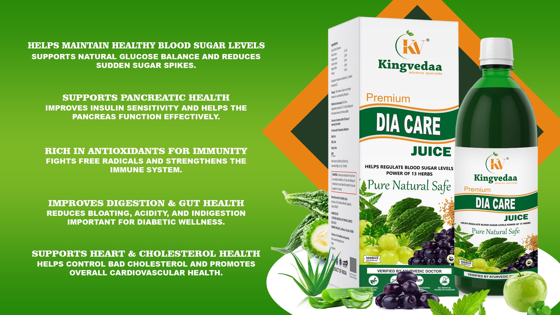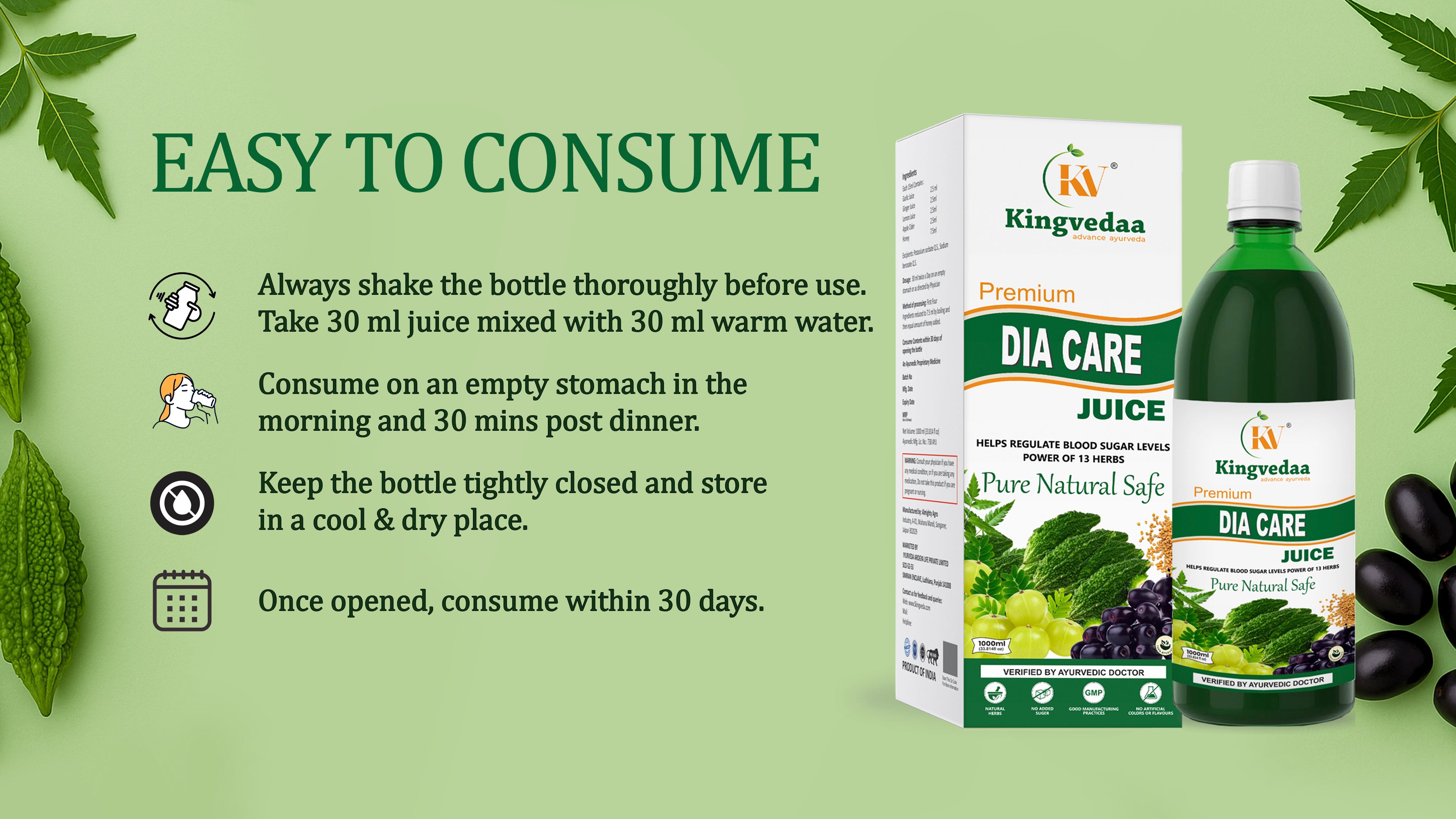 Kingvedaa Premium Dia Care Juice is made with a powerful blend of 13 Ayurvedic herbs, carefully selected for their proven benefits in supporting sugar balance and overall wellness. We use the most effective part of each herb-like the Jamun, karela, Neem, Giloy