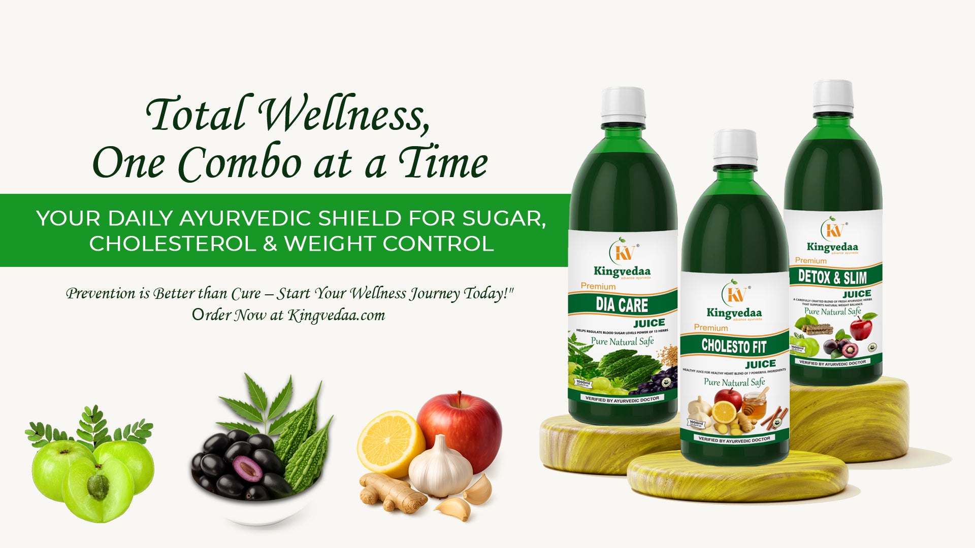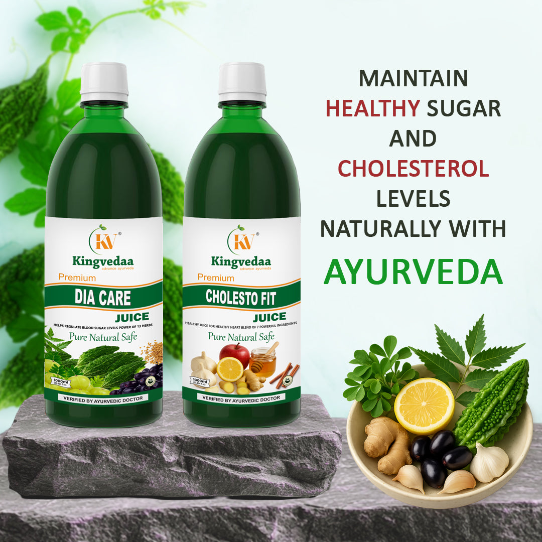 The Kingvedaa Cholesto & Detox–Slim Combo brings together two potent formulations for a balanced and healthier lifestyle. Cholesto Fit Juice is enriched with 7 powerful heart-friendly herbs like Garlic, Cinnamon, Lemon, and Arjuna that help maintain healthy cholesterol, support heart function, and improve blood circulation.
