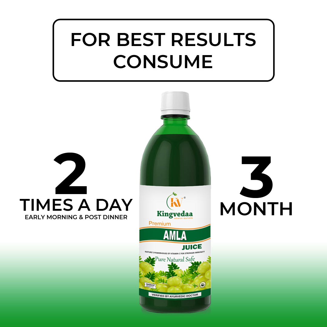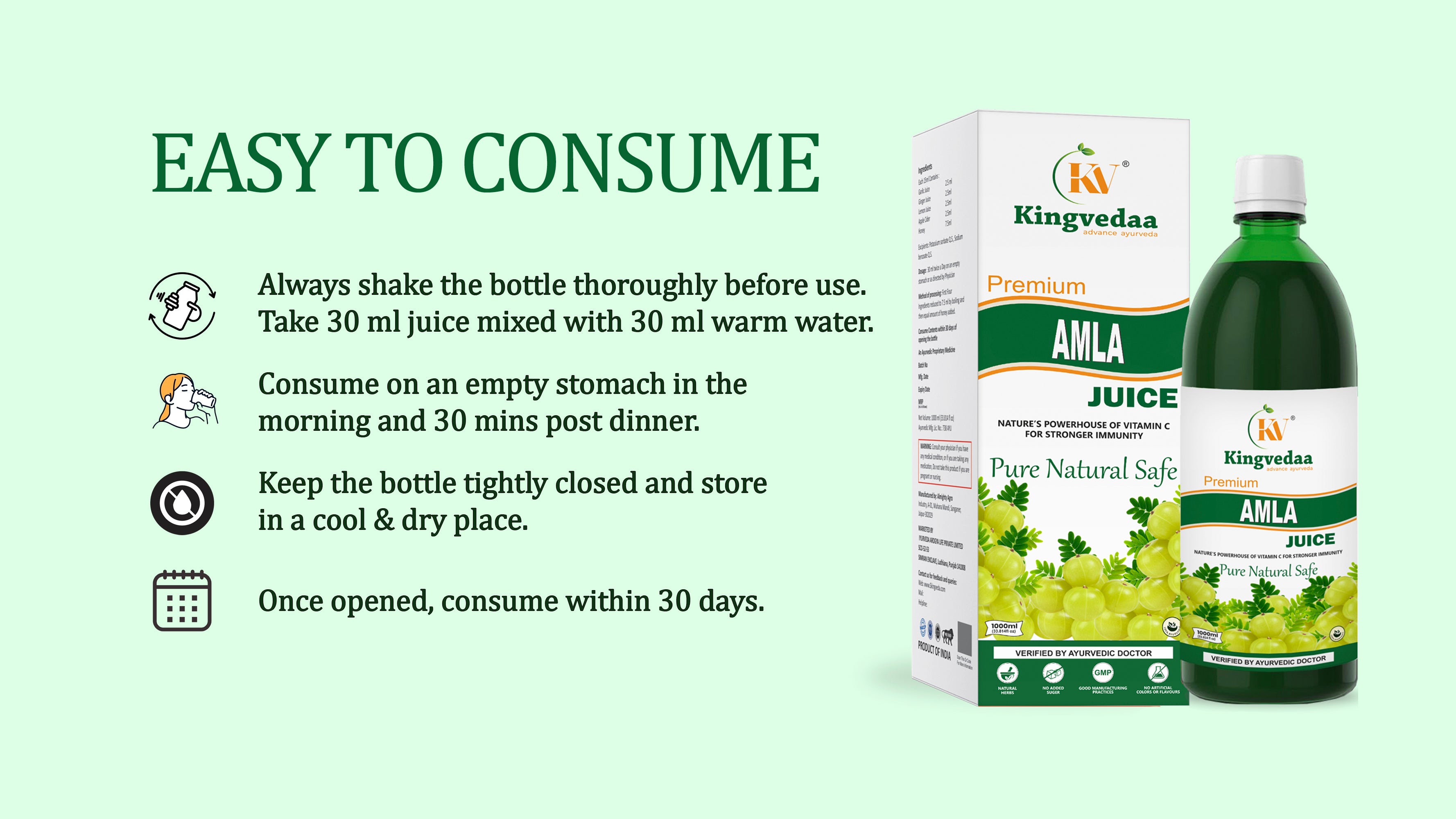Kingvedaa Amla Juice is crafted using 100% cold-pressed wild Amlas that go from farm to bottle within 12 hours, ensuring maximum freshness and nutrition. Each bottle contains the power of 75+ nutrient-rich Amlas, known for their Ayurvedic benefits for immunity, digestion, metabolism, skin, and hair.